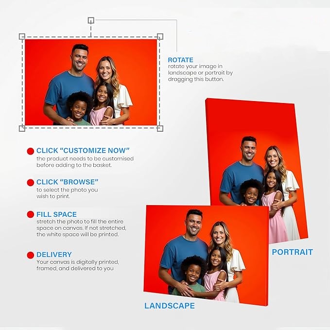 • Turn your favorite photo into beautiful personalized canvas prints wall art. Perfect for family portraits, holiday memories, or special moments.
