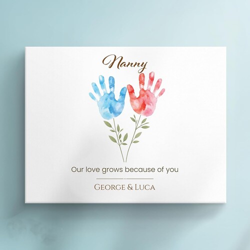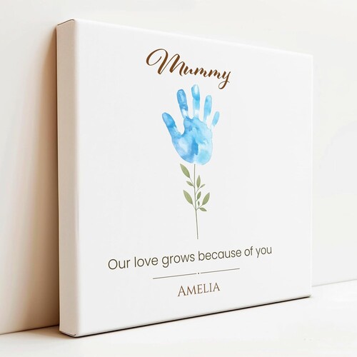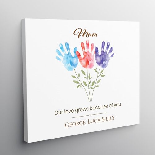 Celebrate Mum with a personalised Mother’s Day canvas featuring up to five colourful family handprints and children’s names. This custom handprint wall art transforms a simple gesture into a meaningful keepsake that she will treasure for years. Designed with the heartfelt message “Our love grows because of you”, the canvas beautifully represents family connection and appreciation. Suitable as a Mother’s Day gift or birthday present for Mum, Nan or Grandma, it offers a thoughtful and emotional way to show gratitude. Each canvas is professionally printed to ensure vibrant colours and a clean finish, creating a decorative piece that complements modern home interiors. The option to add up to six handprints makes it ideal for growing families and siblings. Ready to hang and easy to display, this personalised family canvas provides a lasting reminder of love from daughter or son, making it a sentimental gift that stands out from traditional presents.