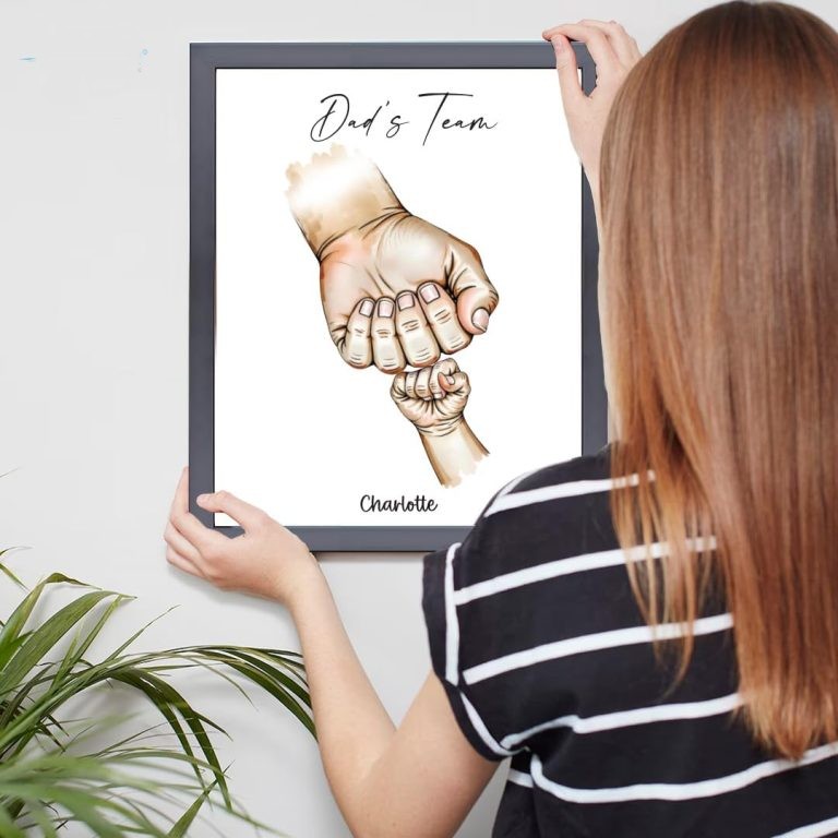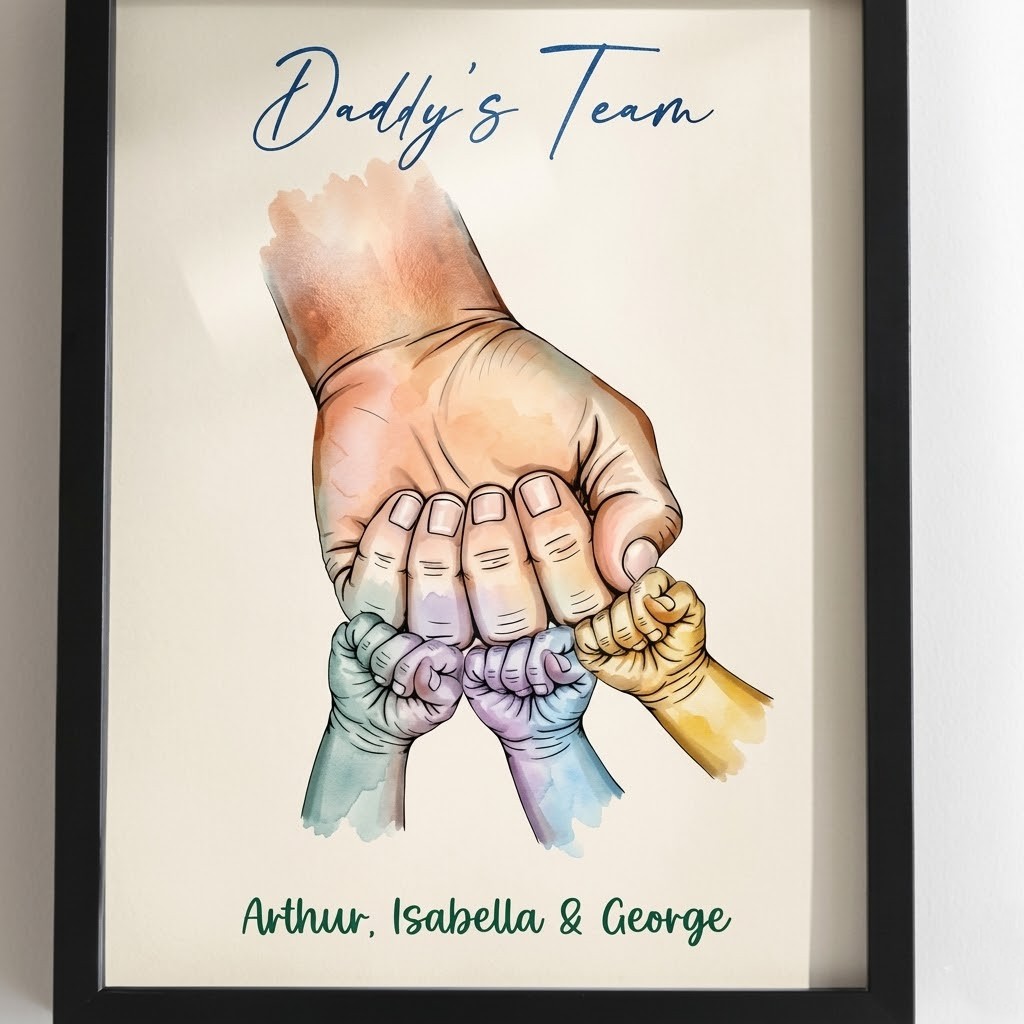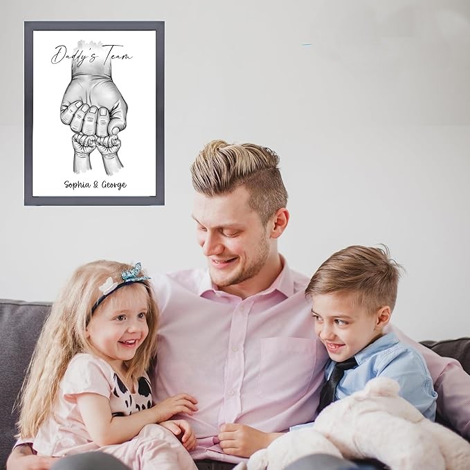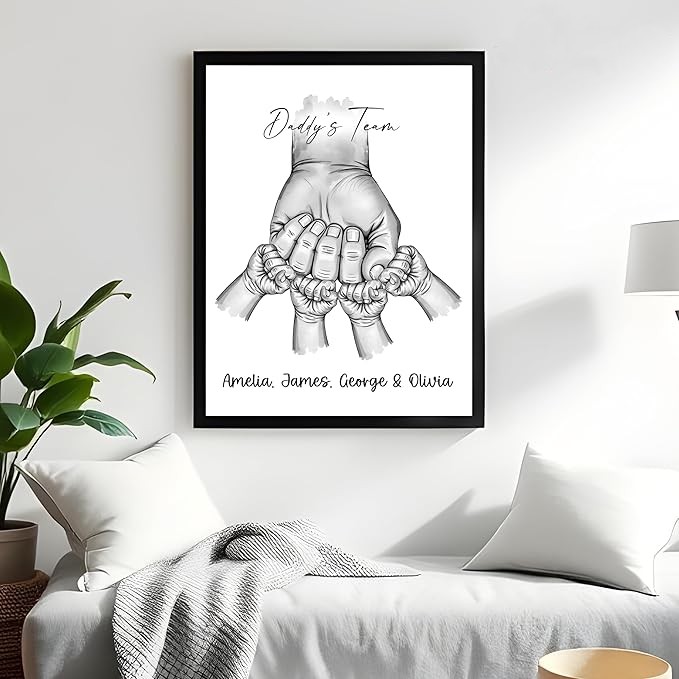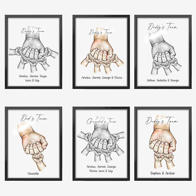 • Personalised Fist Bump Daddy’s : Celebrate Dad with a custom “Fist Bump” print, featuring up to six children’s names. A perfect keepsake for Father’s Day. Designed for easy to hang wall mounting or Tabletop.